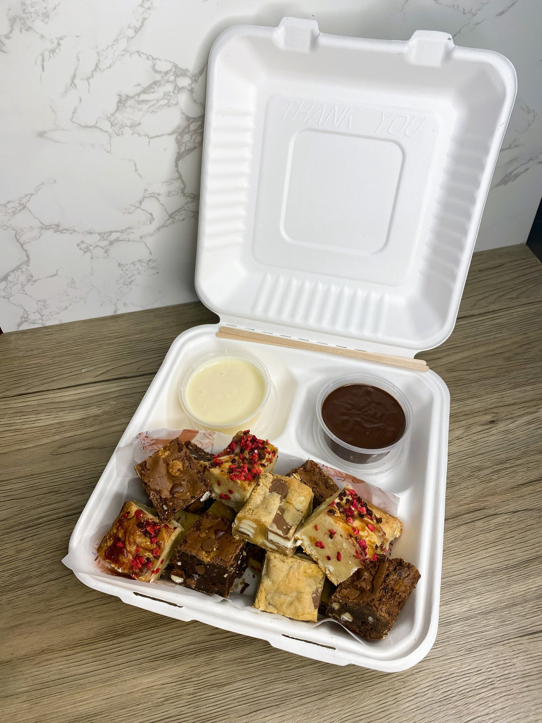 Treat yourself to an adventure with our Bento Bites Box! Enjoy our signature Brownie, Blondie and Cookie bars served bite sized and paired with a choice of two dips from our four made in house dipping pots of Smooth Belgian Milk Chocolate, Creamy Belgian White Chocolate, Gooey Nutella, and Buttery Biscoff.