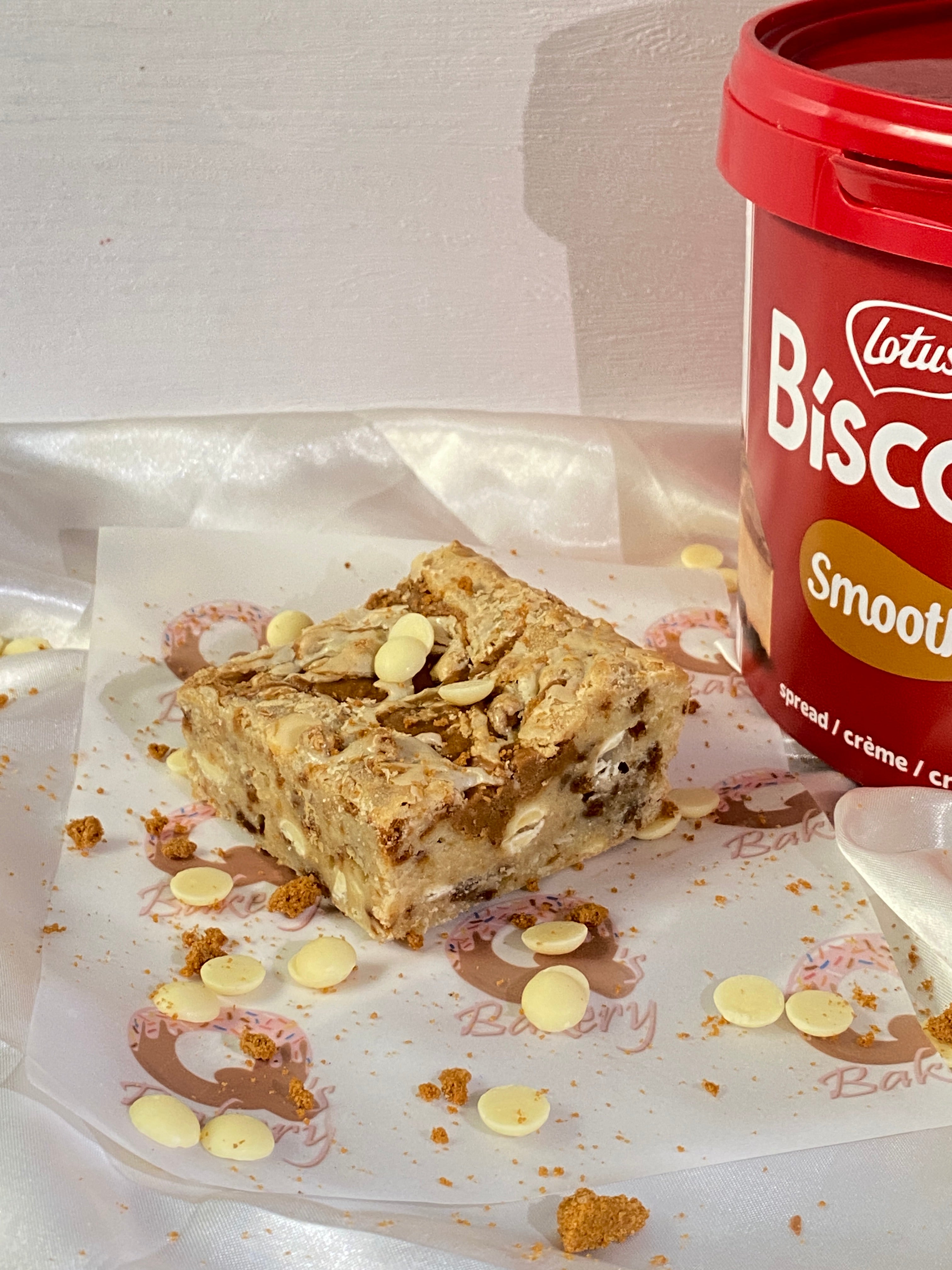 A dream for Biscoff & white chocolate lovers! Our Biscoff & White Chocolate Blondie is a rich, buttery dessert bar that’s chewy and sweet, made with a Belgian white chocolate base. Blondies are like brownies, but without the cocoa—they have a caramel-like, buttery flavour thanks to brown sugar and butter.